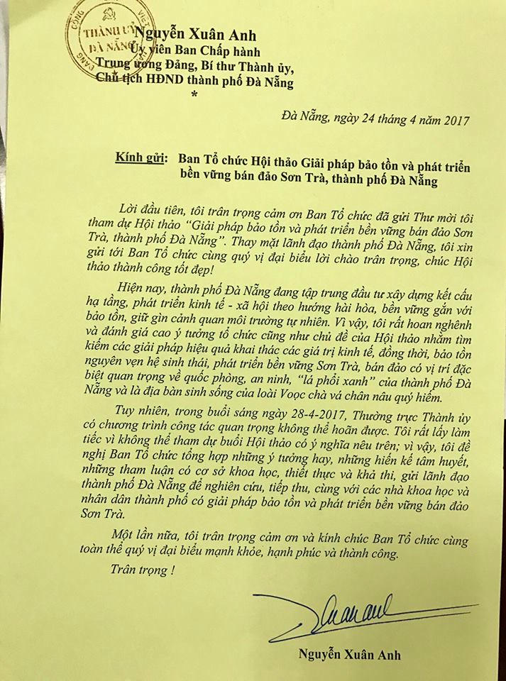 Được mời nhưng không thể tham dự vì có chương trình công tác quan trọng, Bí thư Thành ủy Đà Nẵng Nguyễn Xuân Anh đã gửi thư tới Ban tổ chức với mong muốn hội thảo tổng hợp lại những ý kiến hay, tâm huyết, khoa học…để bảo vệ bán đảo Sơn Trà.