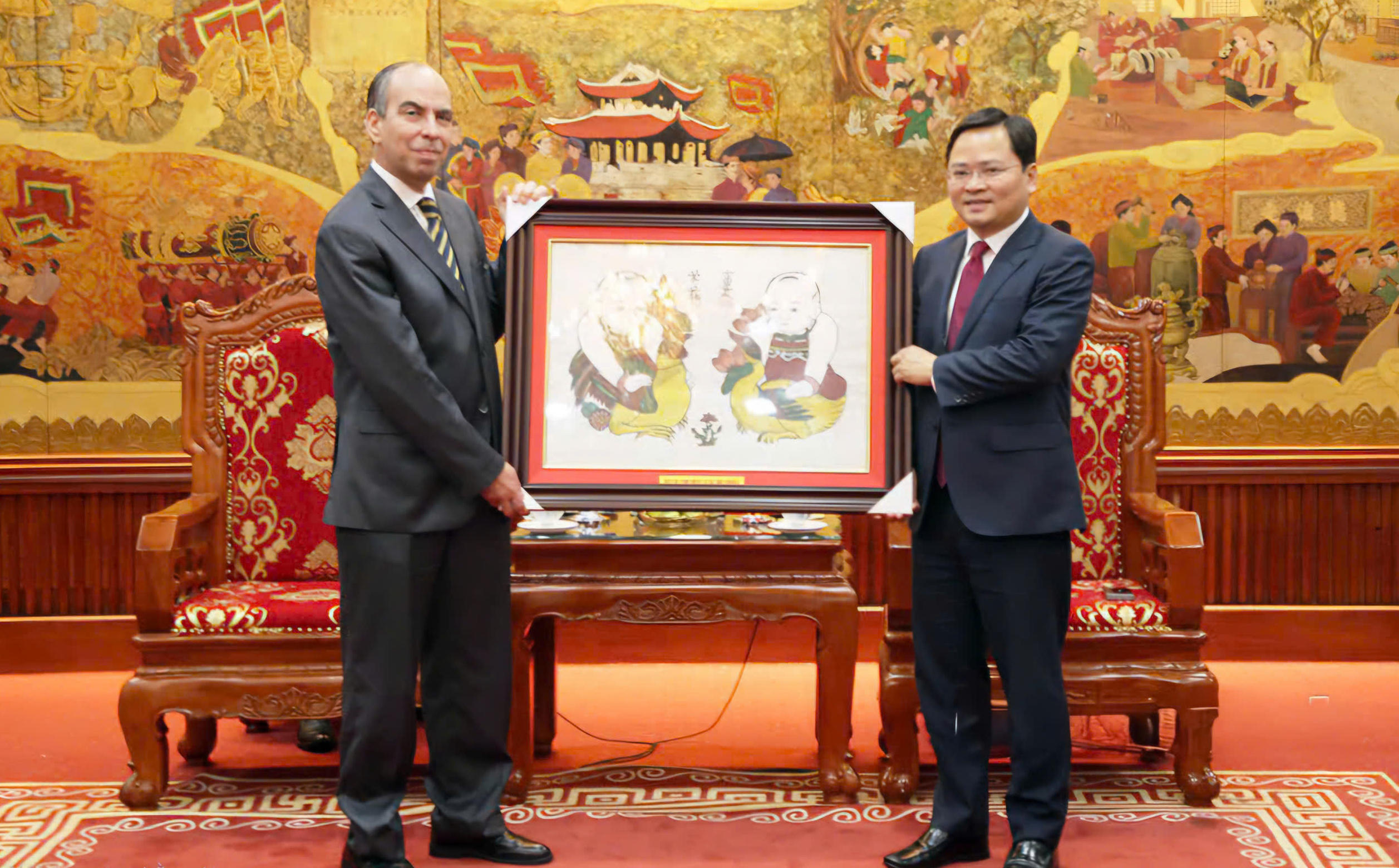Bí thư Tỉnh ủy Nguyễn Anh Tuấn (bên phải) tặng tranh dân gian Đông Hồ cho Đại sứ Cuba tại Việt Nam Rogelio Polanco Fuentes. |