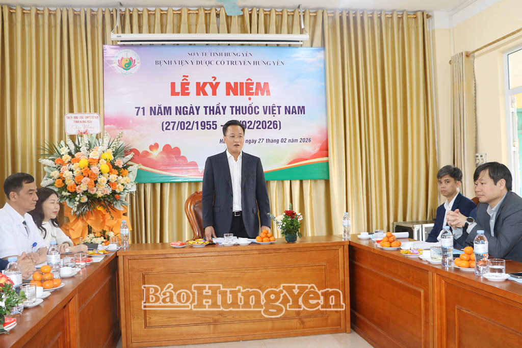 (PLVN) - Nhân kỷ niệm 71 năm Ngày Thầy thuốc Việt Nam (27/2/1955 – 27/2/2026), ngày 27/2, Bí thư Tỉnh ủy Hưng Yên Nguyễn Hữu Nghĩa, Ủy viên Ban Chấp hành Trung ương Đảng, đã đến thăm, chúc mừng đội ngũ cán bộ, y, bác sĩ, người lao động Bệnh viện Y dược cổ truyền Hưng Yên và thầy thuốc tiêu biểu trên địa bàn. Cùng đi có Trưởng ban Tuyên giáo và Dân vận Tỉnh ủy Nguyễn Văn Chiến và Phó Chủ tịch UBND tỉnh Hưng Yên Phạm Văn Nghiêm.
