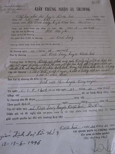 Trong Giấy chứng nhận bị thương do UBND huyện Điện Bàn cấp, phần các vết thương có ghi rõ: ông bị 1 vết ở đầu, 1 vết ở ngực, 3 vết ở chân trái, 1 vết ở dương vật còn mảnh…