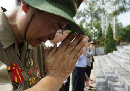 Đứng trước ngôi mộ ghi thông tin liệt sĩ Đào Văn Tiến (người Hà Nội), cựu binh Lê Huy Tâm (51 tuổi) như vỡ òa: "Mày nhớ không Tiến? Hôm đó, 7 thằng đang ăn thì hết cơm. Bọn mày chạy sang tiểu đội anh Đôn bê nồi cơm về ăn tiếp. Tao bảo kiêng không ăn cơm hai nồi nhưng bọn mày cười xòa. Lính trẻ vô tư, nào có nghĩ gì. 30 năm rồi đấy. Đến hôm nay, nhìn tấm bia tao mới biết mày ít tuổi hơn, thế mà hồi đó tao vẫn gọi mày là anh vì nhập ngũ sau", ông Tâm cười, tiếng cười nghẹn nơi cổ họng, vai khẽ rung lên.