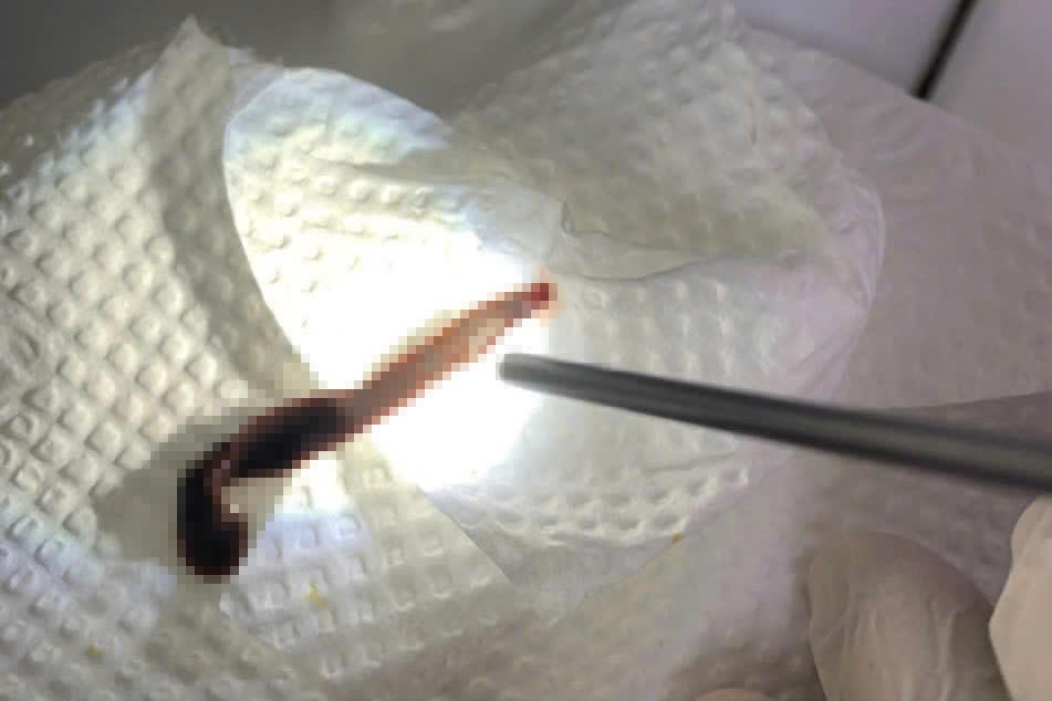 | Con vắt được gắp ra khỏi mũi người phụ nữ. |