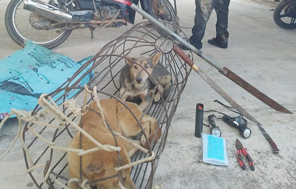 Tang vật thu giữ tại chỗ gồm: 2 con chó, 1 xe máy, 2 cái kiếm, 2 bao tải, 2 đèn pin, 1 bộ kích điện, 1 dao găm, 1 bình xịt hơi cay, 3 cuộn băng dán…
