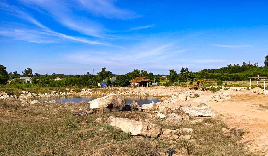 Đá được bỏ ngổn ngang gần hồ nuôi cá. |