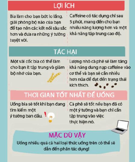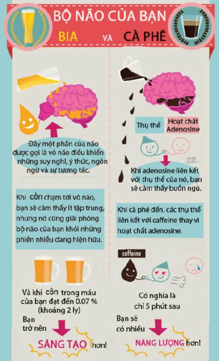 Bạn có biết uống bia tốt nhất khi muốn tìm ý tưởng mới, và cà phê tốt nhất khi bạn muốn thực hiện ý tưởng đó. Thông tin dưới đây sẽ cho bạn biết tác động cụ thể của bia và cà phê tới bộ não.