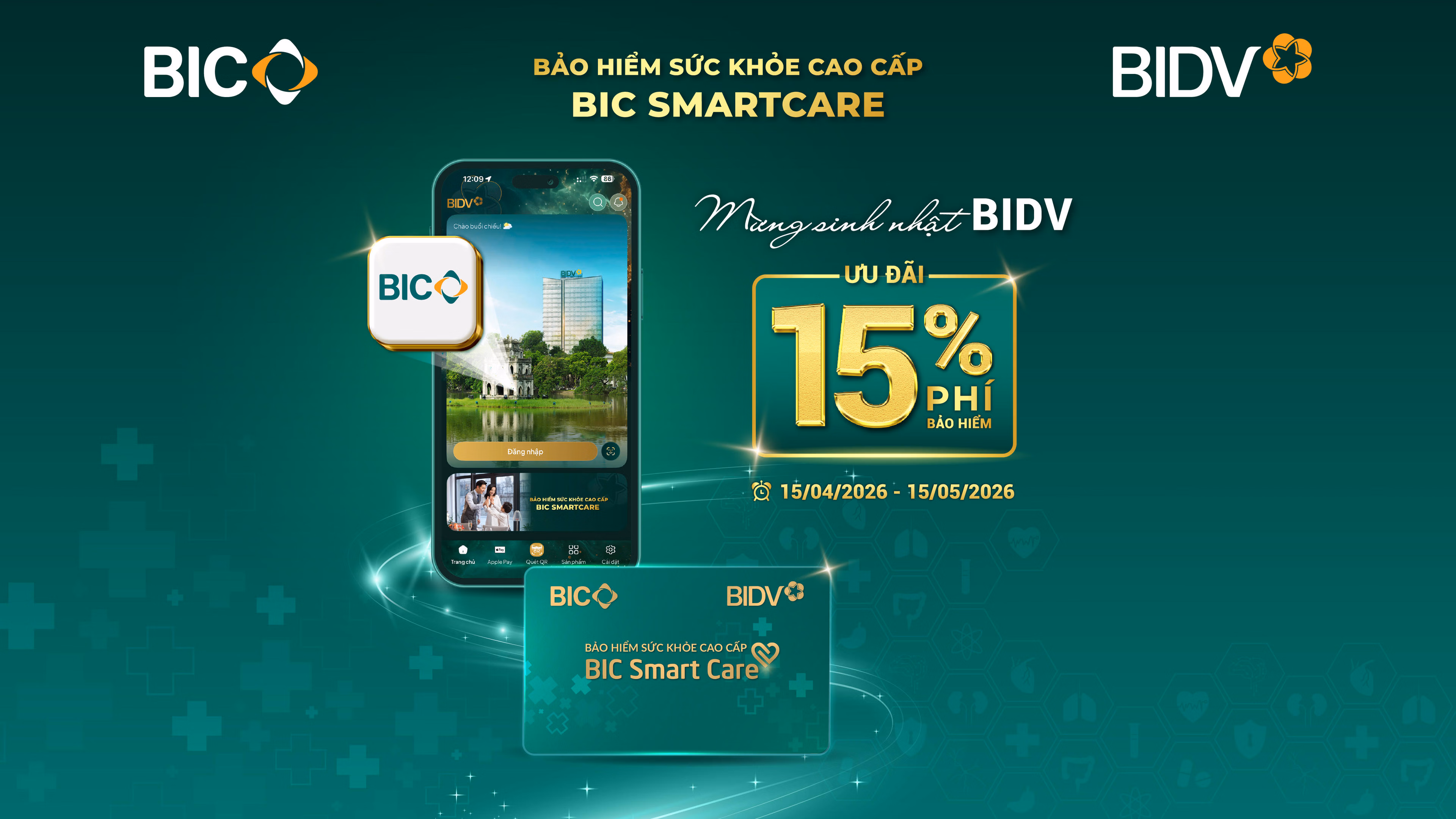 Chào mừng kỷ niệm 69 năm ngày thành lập Ngân hàng TMCP Đầu tư và Phát triển Việt Nam (26/04/1957 – 26/04/2026), Tổng Công ty Bảo hiểm BIDV (BIC) gửi tặng khách hàng chương trình ưu đãi giảm 15% phí khi tham gia bảo hiểm sức khoẻ cao cấp BIC SmartCare.