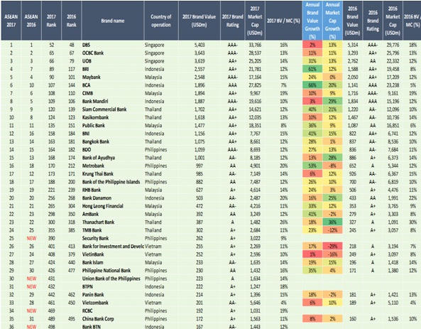 Theo đó, Việt nam có 3 ngân hàng thương mại được lọt vào Top 500 thương hiệu ngân hàng giá trị nhất thế giới năm 2017. BIDV được định giá là thương hiệu ngân hàng đứng đầu Việt Nam; đứng thứ 26 trong các ngân hàng ASEAN; đứng thứ 401 trong các Ngân hàng toàn cầu, tăng 12 bậc so với năm 2016.