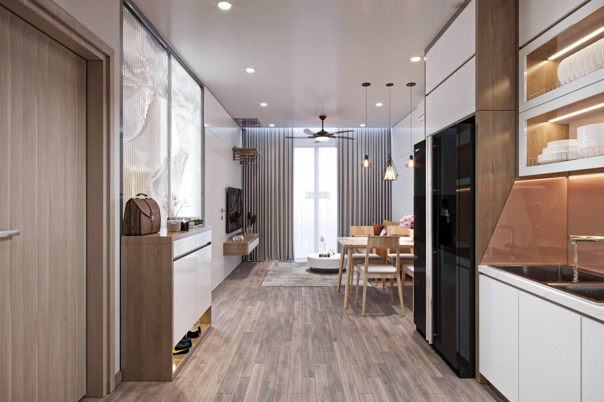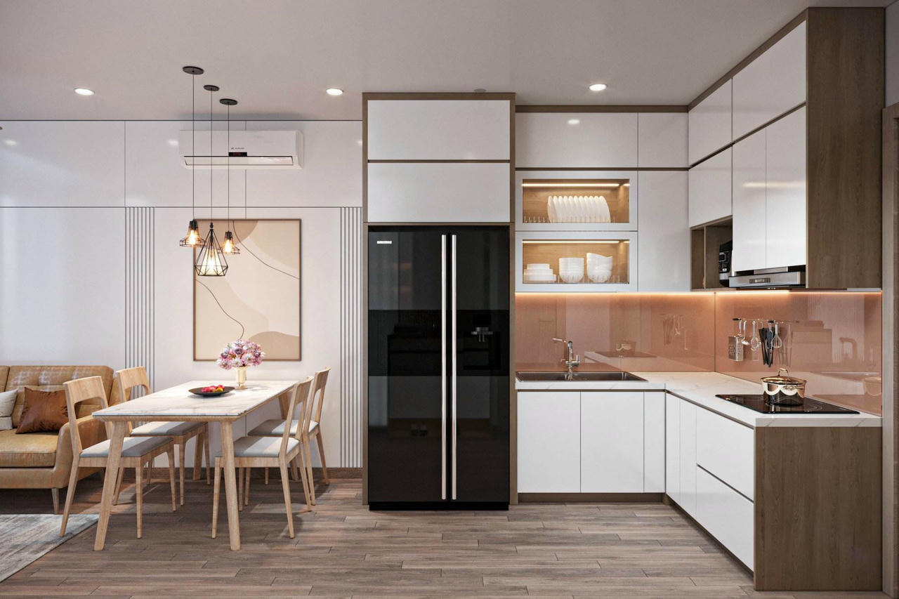 Khu vực phòng khách thông bếp+bàn ăn hiện đại, cấu trúc đơn giản, nhẹ nhàng nhằm tạo khoảng không thoáng đãng cho mọi người sinh hoạt chung. |
