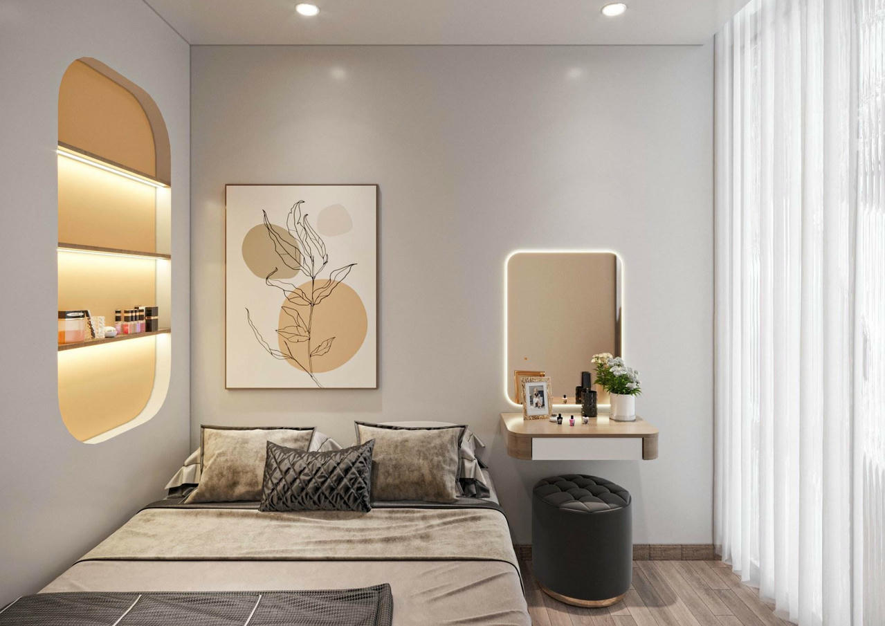 Tuy nhiên nếu gia đình không đủ điều kiện, chỉ mua được căn 1,5 ngủ (Căn hộ có 1 ngủ và 1 phòng đa năng nhỏ, có thể dùng làm việc, nghỉ ngơi…), kiến trúc sư sẽ đưa ra một số giải pháp để thiết kế đủ không gian cho cả gia đình.