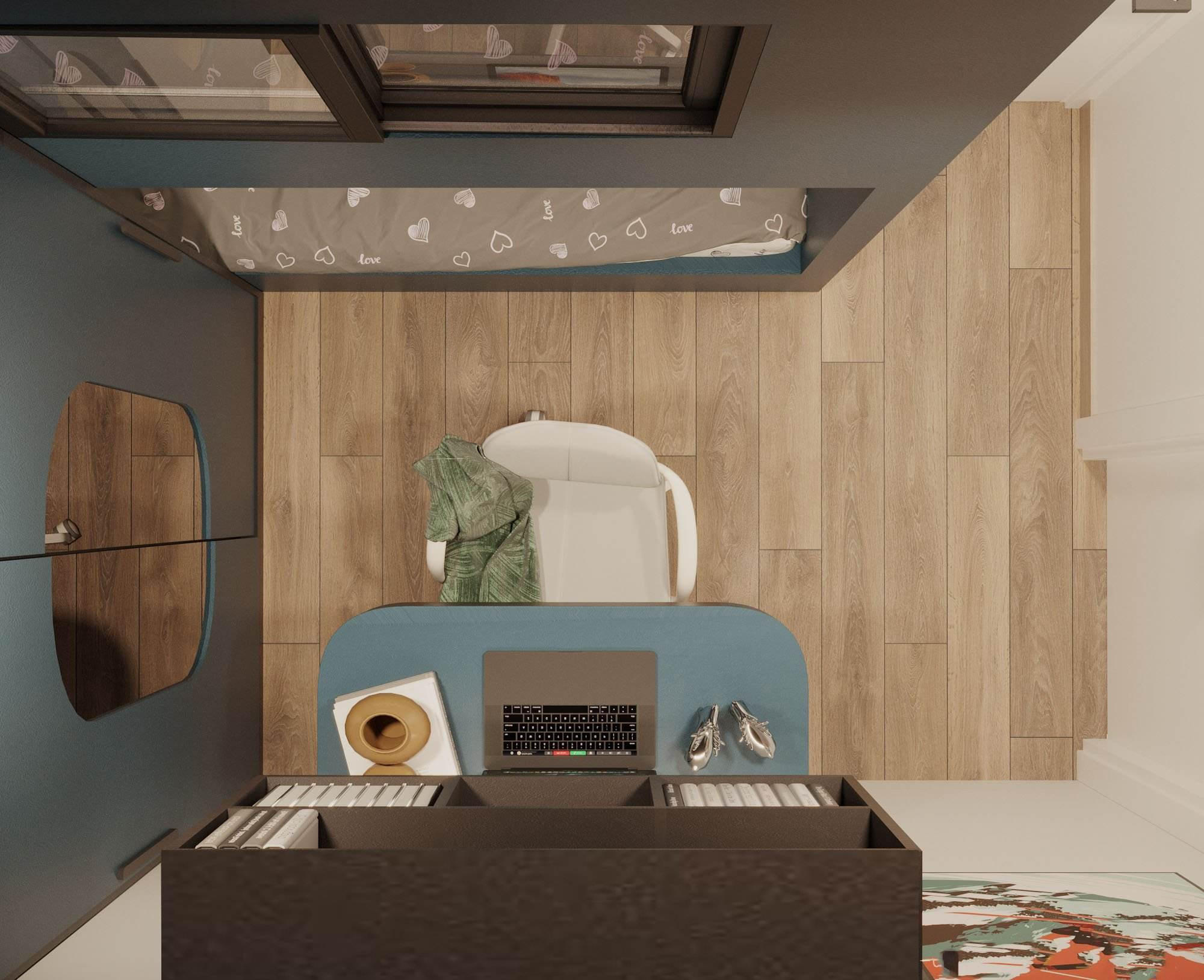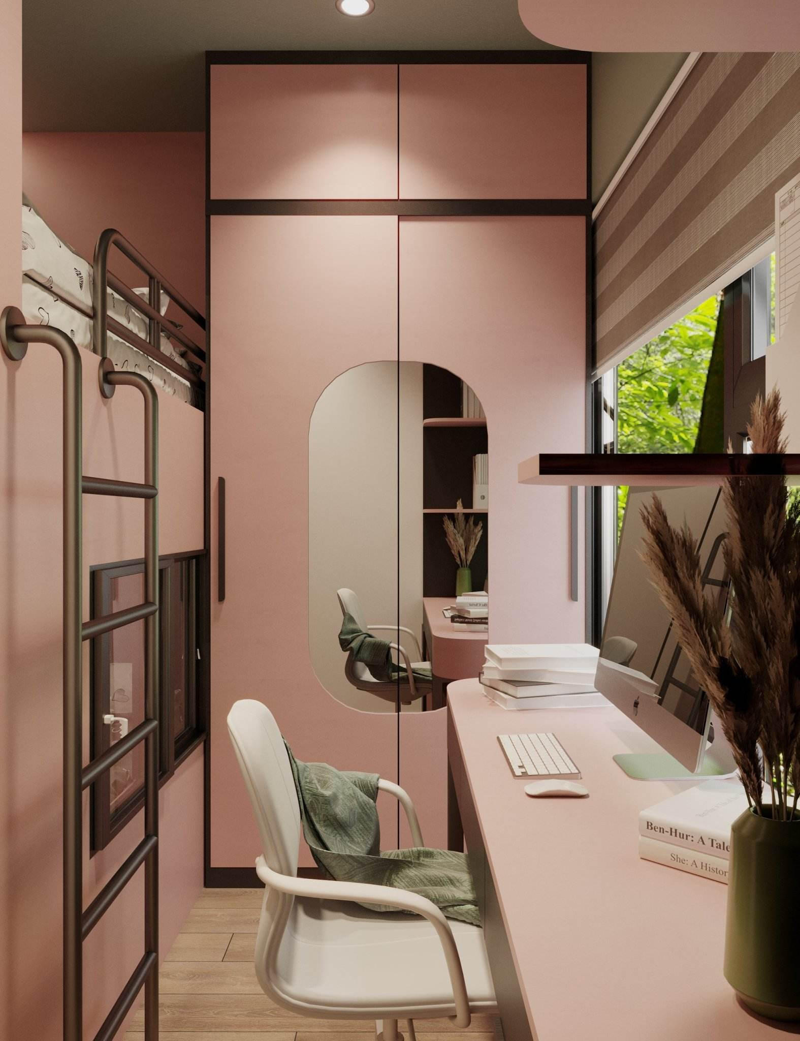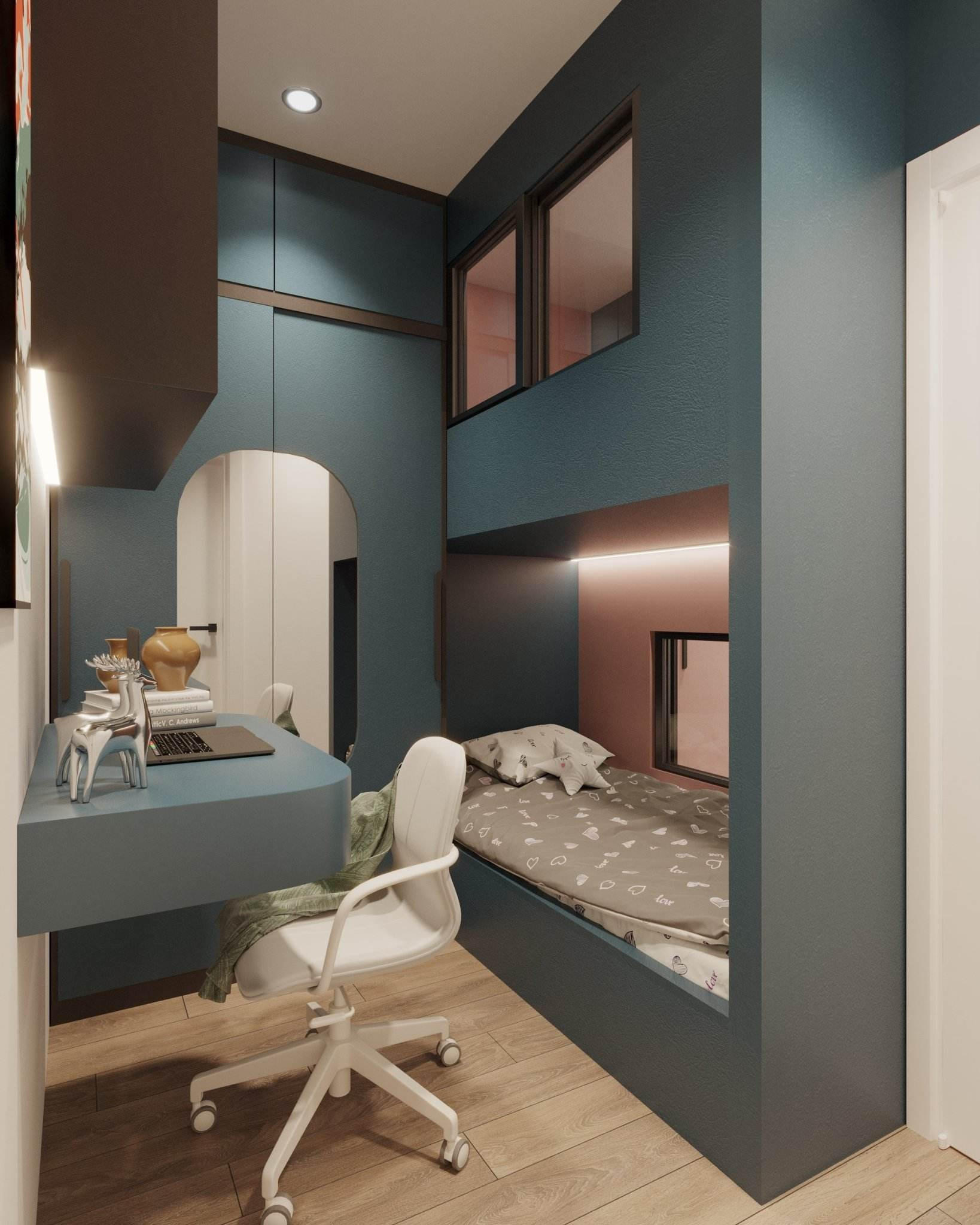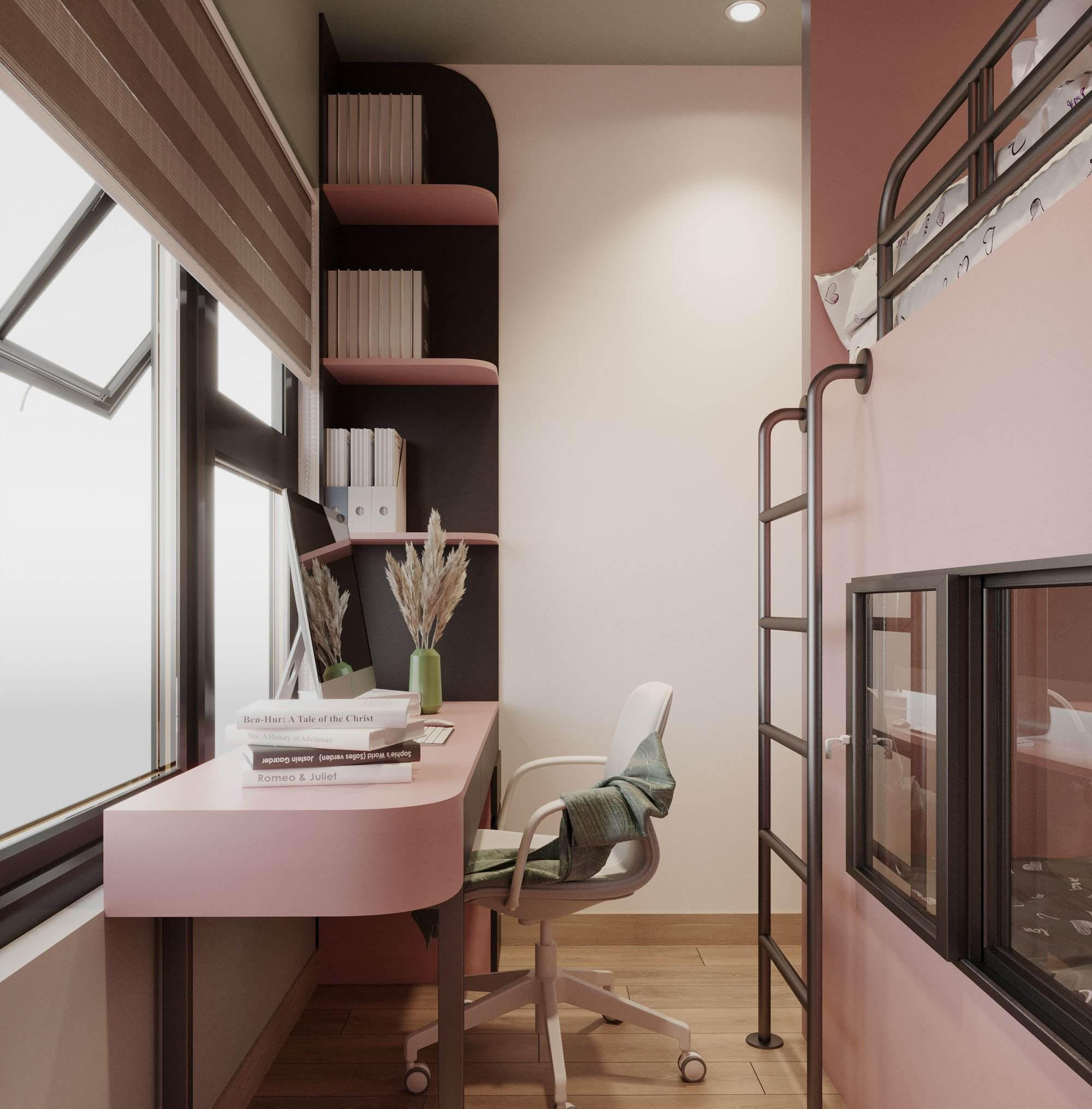 Phòng ngủ bé gái hướng ra cửa sổ nhiều ánh sáng. Để phòng bé trai không bị bí, ở phần vách ngăn hai phòng, nhóm dùng cửa kính lấy sáng. |