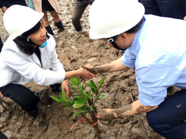 | Bộ trưởng Trần Hồng Hà và bà Akiko Fujii, Quyền Giám đốc quốc gia, Chương trình Phát triển Liên hợp quốc (UNDP) tại Việt Nam bắt tay sau khi trồng xong một cây xanh ngập mặn. |
