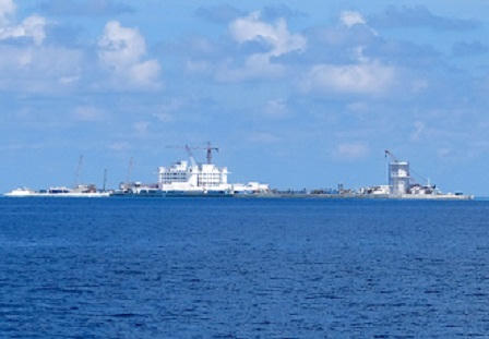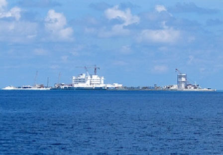 | Từ khoảng cách vài hải lý vẫn có thể nhìn rõ các công trình xây dựng trái phép của TQ trên đá Huy Gơ của Việt Nam. |