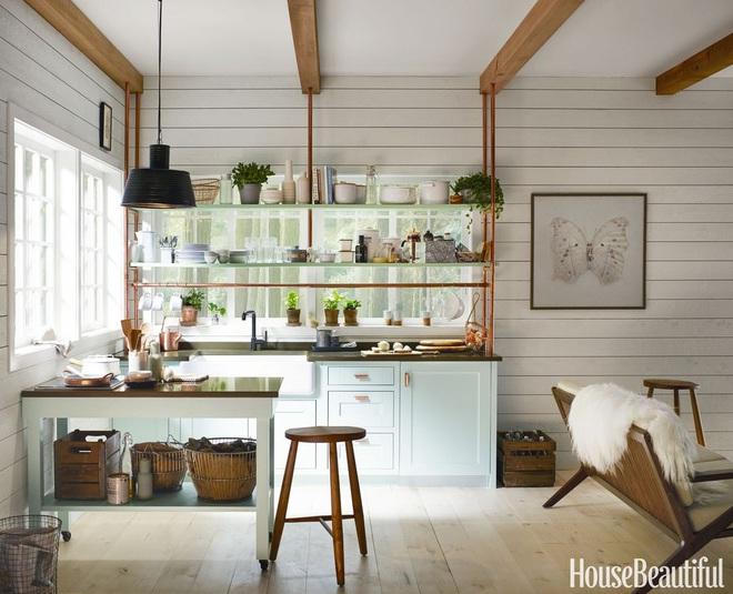 Góc nhỏ chỉ rộng 7 m2 này được nhà thiết kế Kim Lewis biến hóa thành căn bếp đẹp, hiện đại nhờ những ý tưởng thông minh. Ấn tượng nhất trong số đó là hệ kệ để đồ lộ thiên. Ngoài ra, nhà thiết kế còn thận trọng trong việc chọn lựa từ màu sắc tới loại bồn rửa. Tất cả tạo nên sự hài hòa đáng kinh ngạc.