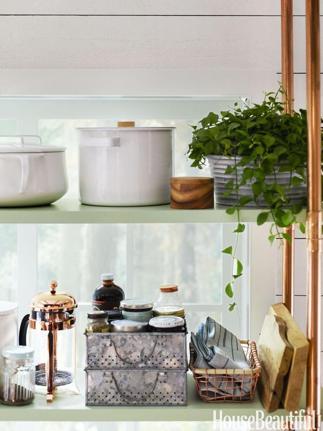 Thiết kế hệ kệ lộ thiên trên tường có giá đỡ bằng ống đồng có móc để treo cốc và dụng cụ nấu nướng giúp tổng thể quầy lưu trữ đồ không bị lộn xộn. Lewis đã chọn vật liệu cho bộ kệ này bằng đồng hoàn toàn từ thương hiệu Schoolhouse Electric & Supply để phù hợp với các giá đỡ bằng đường ống.
