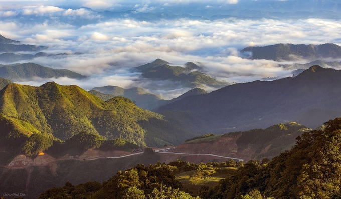 Khi bình minh lên cũng là lúc mây giăng qua từng triền núi, tạo nên không gian huyền ảo nơi núi cao.