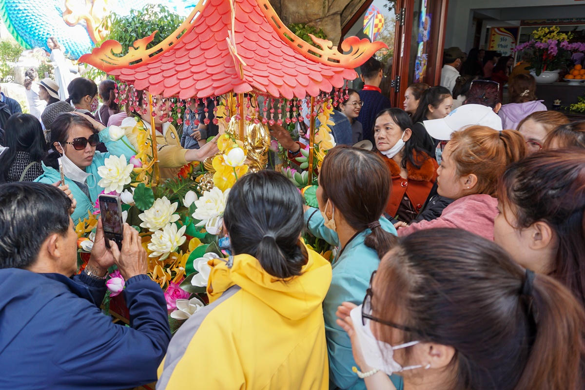 Khi phần lễ chính kết thúc, người dân chen chân sờ tượng phật Quán Thế âm để cầu sức khỏe và may mắn.