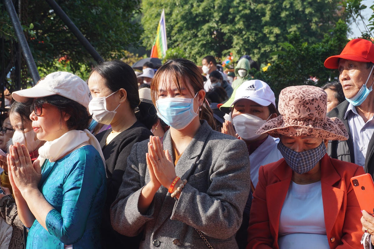 Khách tham dự nghiêm trang cầu nguyện khi tượng Phật được rước qua.