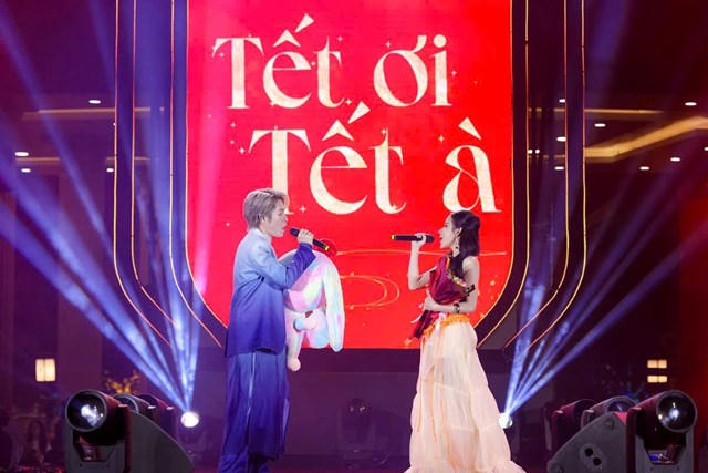 Hai ca sĩ Đức Phúc và Ly Ly xuất hiện trên sân khấu, mang tới những ca khúc mang âm hưởng đón Tết, chào Xuân sôi động. |