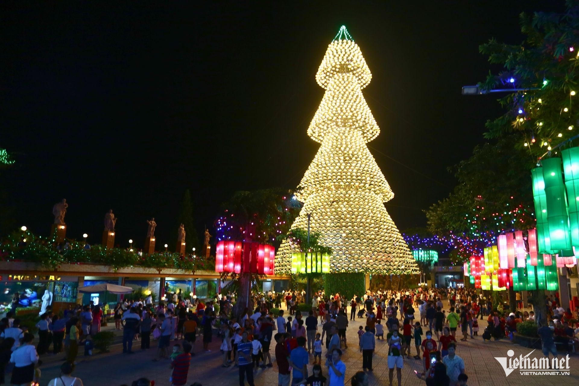 Hơn 3.800 nón lá được kết thành cây thông Noel cao gần 40m tại Đồng Nai. Mỗi tối, nơi đây trở thành điểm check-in thu hút hàng nghìn lượt khách tham quan (Ảnh: Vietnamnet) |
