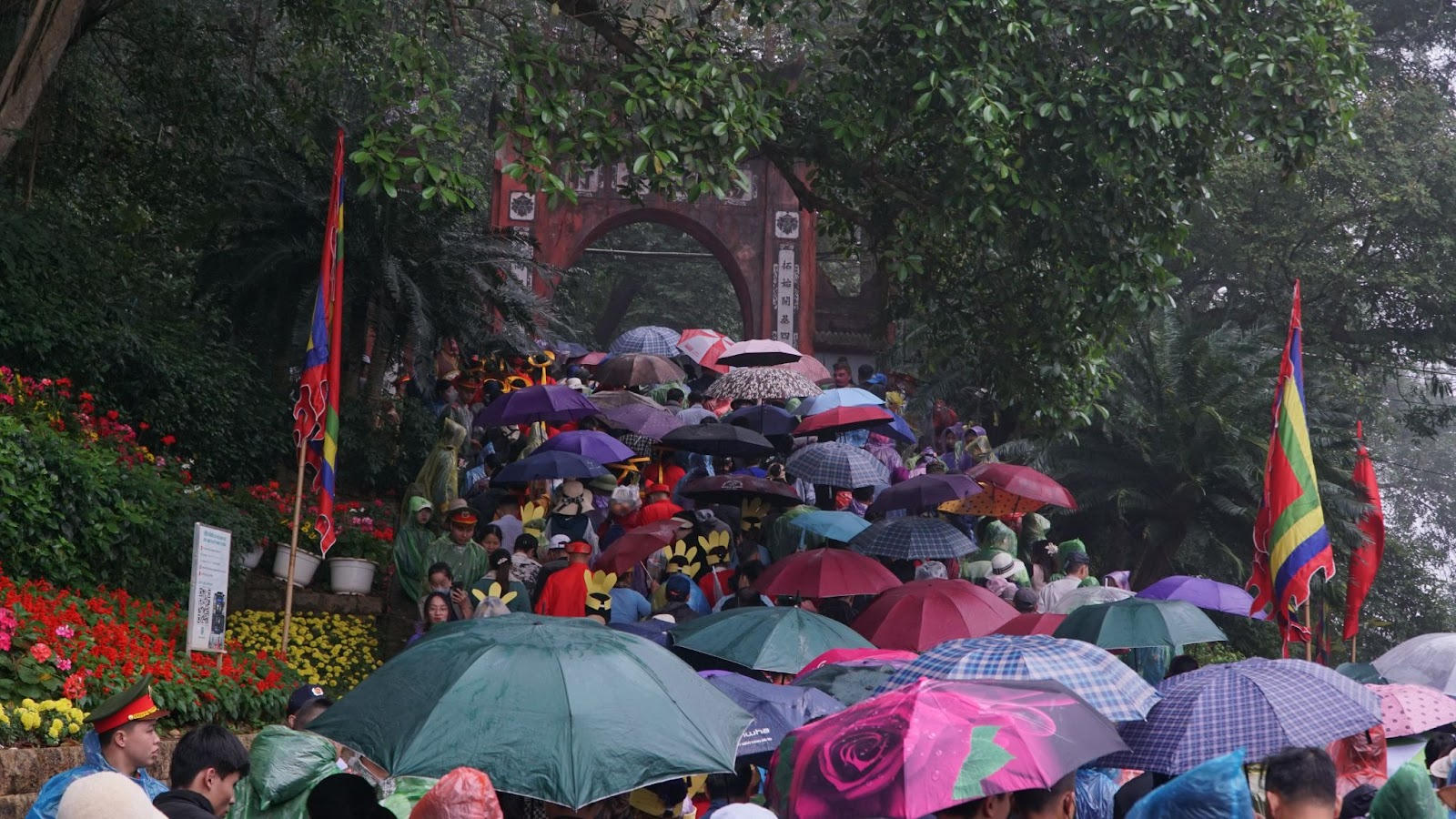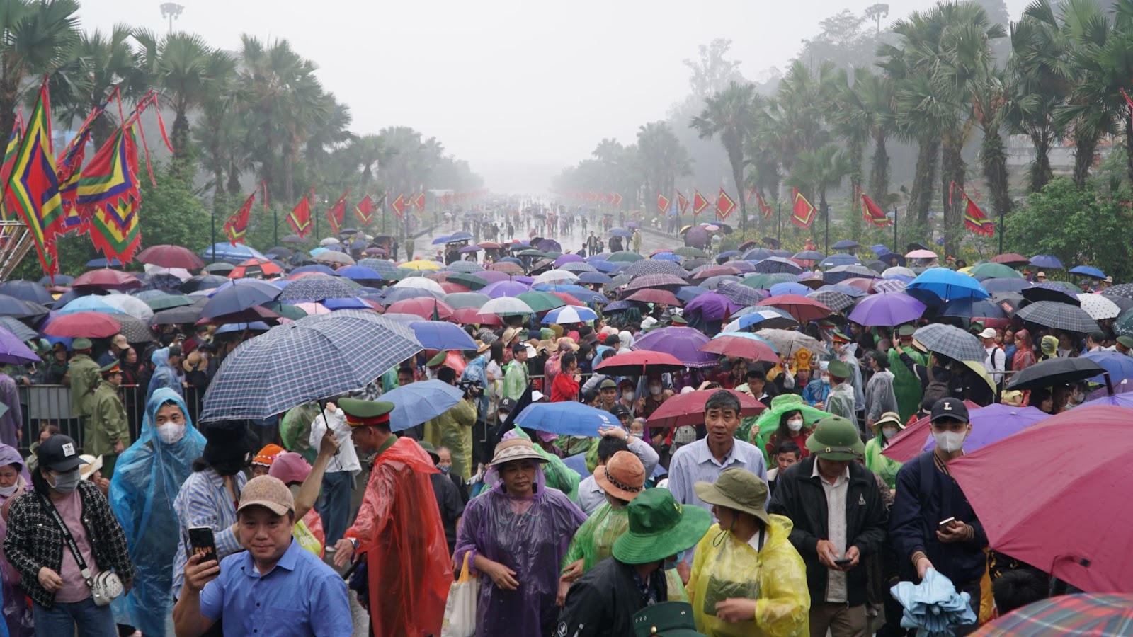 Dưới cơn mưa phùn se lạnh, người dân vẫn kiên nhẫn chờ đợi dưới những chiếc ô nhỏ, trên những tấm chiếu mỏng manh trải vội. Ai cũng mang trong mình một lòng thành kính, một niềm tin vào ngày hội linh thiêng. (Ảnh: Lê Đình Tùng)