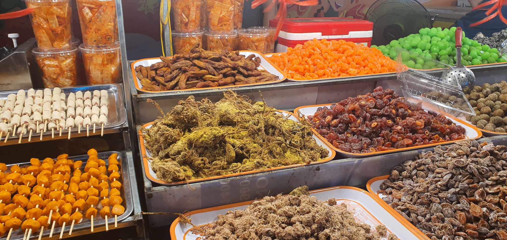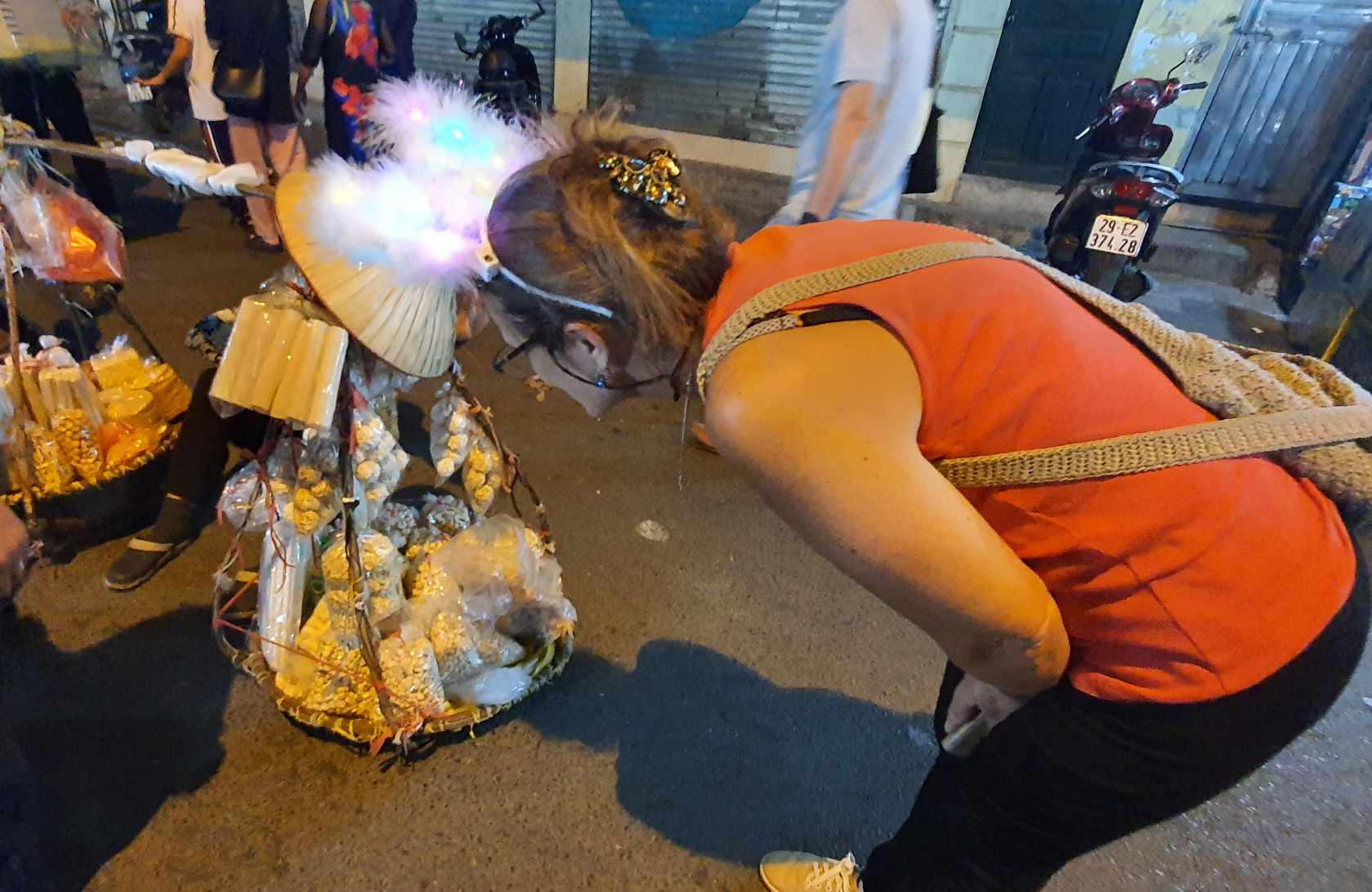 | Du khách nước ngoài thích thú với gánh quà ăn vặt của người Việt. |