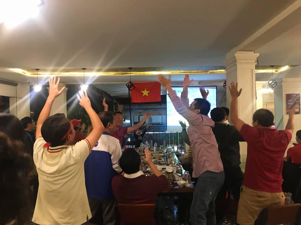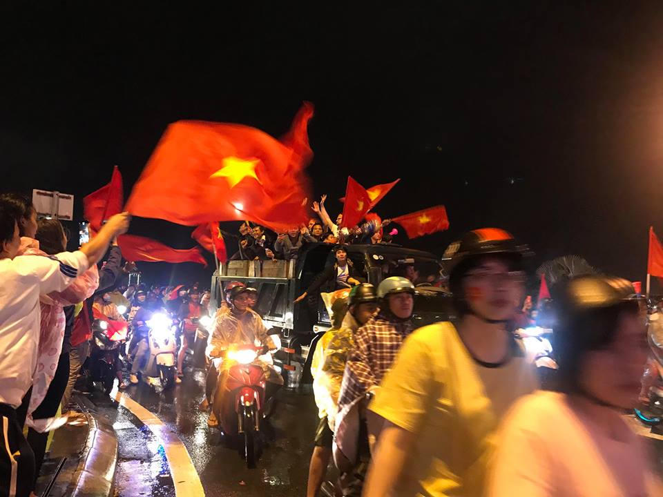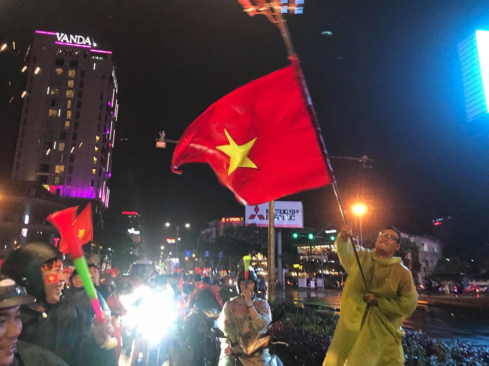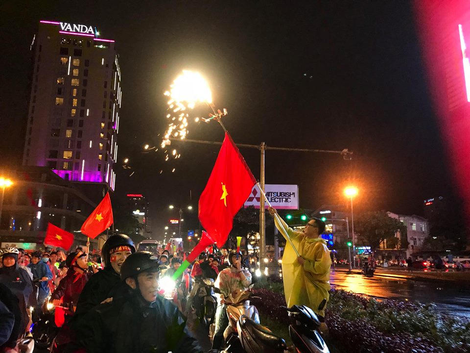 (PLO) - Ngay sau khi tiếng còi của trọng tài vang lên, dù Đà Nẵng mưa rất to, nhưng hàng nghìn cổ động viên vẫn xuống đường, ôm nhau nhảy múa, ăn mừng chức mừng chiến thắng chung cuộc của đội Việt Nam.