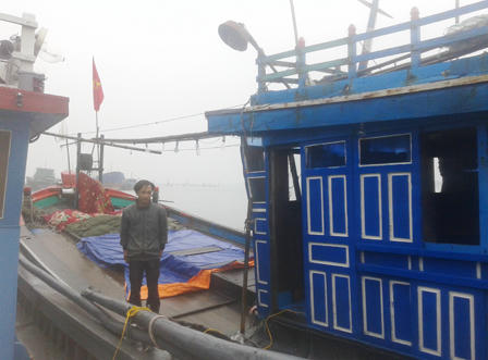 | Anh Toán bên con tàu cá gặp nạn được lai dắt vào bờ |
