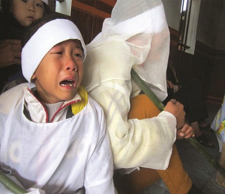 Con trai thuyền viên Bùi Văn Hoài khóc ngất bên ban thờ bố