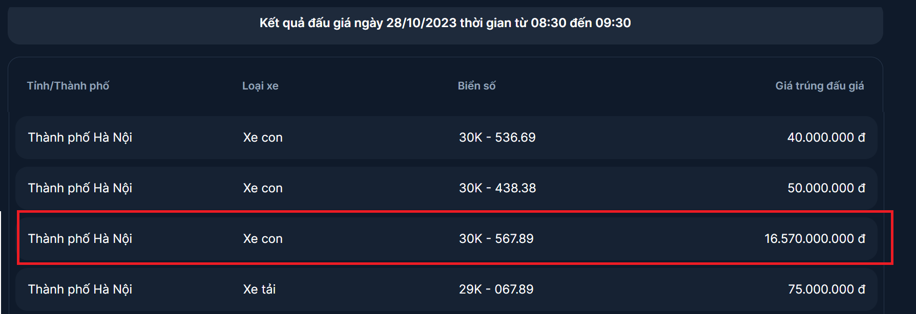 Kết quả sáng 28/10, biển số 30K-567.89 được người mua chốt giá cao nhất là 16,57 tỷ đồng. Đây là biển số đầu tiên trong số 6 biển số xe ô tô được đấu giá lại có mức trúng đấu giá tăng.