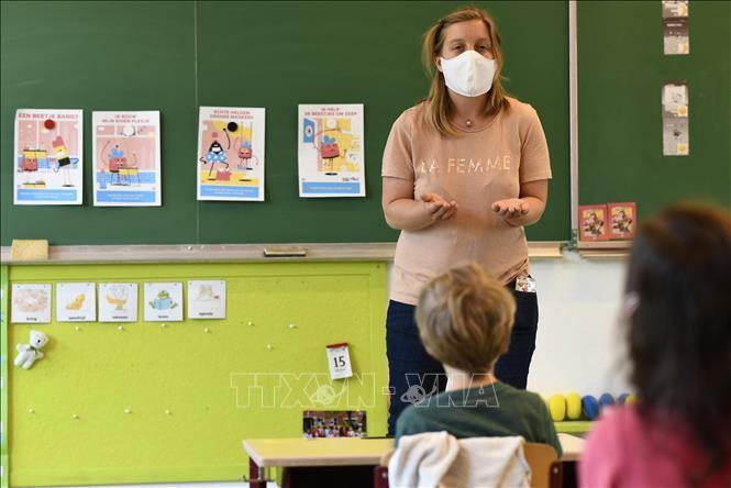 Giáo viên và học sinh đeo khẩu trang phòng lây nhiễm COVID-19 tại một lớp học ở Brussels, Bỉ. Ảnh: AFP/TTXVN