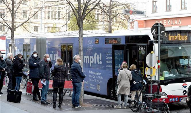 Người dân xếp hàng chờ tiêm vaccine phòng COVID-19 tại Vienna, Áo, ngày 10/11. Áo là quốc gia châu Âu đầu tiên áp dụng quy định tiêm vaccine phòng COVID-19 bắt buộc đối với tất cả người dân. Ảnh: THX/TTXVN