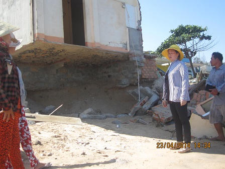 Kể từ đêm đó, mọi thứ đều đổ sụp xuống trước mắt tôi: Mất nhà, chồng bị thương. Ngôi nhà cấp 4 hai vợ chồng đã vay mượn để xây dựng, đến nay chưa trả hết nợ thì đã bị biển cuốn trôi. Trong thời gian qua, hai vợ chồng tôi phải nhờ bà con lối xóm thương tình cho ở nhờ qua ngày chứ không có đất đai để dựng lều tạm bợ”, chị Lê Thị Mai (43 tuổi, người dân thôn Tiến Đức) nghẹn ngào tâm sự.