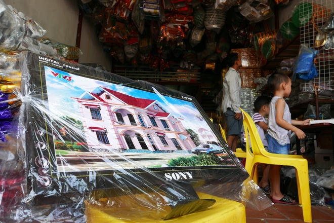 Tháng 7 âm lịch là dịp đồ vàng mã tiêu thụ mạnh nhất ở Đông Hồ (Thuận Thành, Bắc Ninh). Người dân nơi đây đã làm ra đủ thứ mặt hàng. Trong ảnh là chiếc tivi LCD, giá khoảng 30.000 đồng.