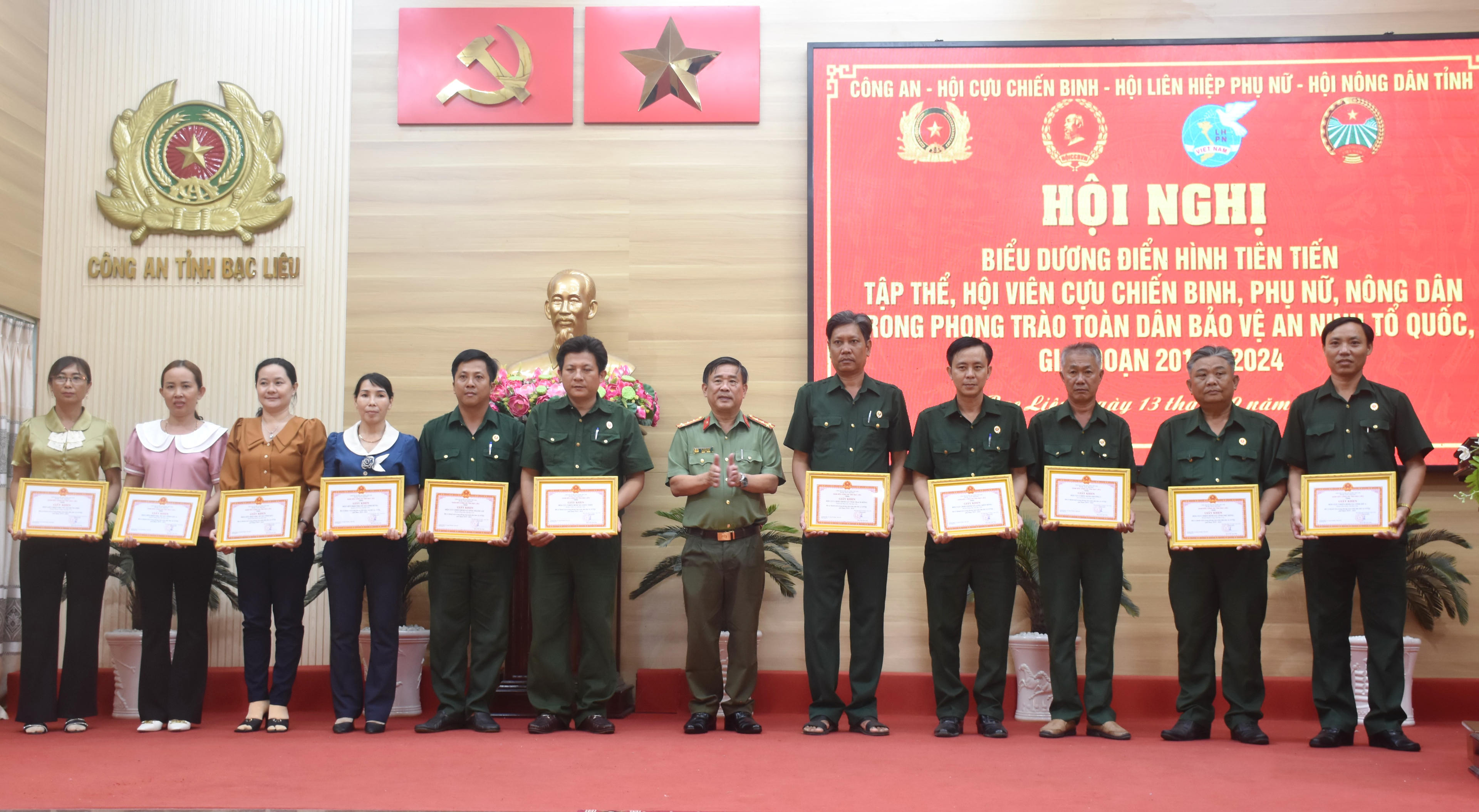 (PLVN) - Chiều 13/9, Công an tỉnh Bạc Liêu phối hợp với Hội Cựu chiến binh, Hội Nông dân và Hội Liên hiệp phụ nữ tỉnh tổ chức Hội nghị biểu dương điển hình tiên tiến tập thể, hội viên cựu chiến binh, phụ nữ, nông dân trong phong trào toàn dân bảo vệ an ninh Tổ quốc (ANTQ), giai đoạn 2019 - 2024.