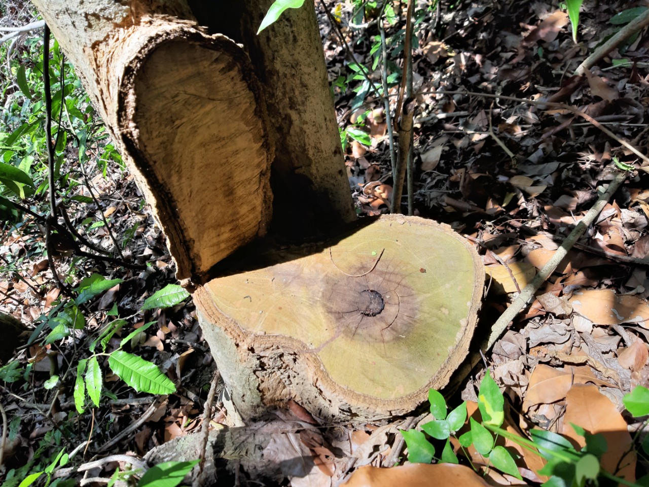 Càng tiến sâu hơn vào những cánh rừng khác, chúng tôi ghi nhận diện tích rừng bị đốn hạ lên đến cả gần chục ha. Trong đó, có hàng chục loại cây gỗ quý thuộc nhóm I, II, III, IV vừa mới bị cưa hạ chỉ còn sót lại dấu vết mùn cưa ở dưới đất.