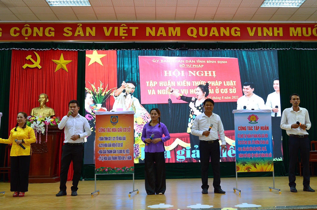 Được biết, toàn tỉnh Bình Định hiện đang có 1.121 tổ hòa giải và 8.219 HGV, trong những năm qua đã hòa giải thành gần 15 ngàn vụ, việc, đạt tỷ lệ trên 80%/năm; tổ chức tập huấn kỹ năng Hòa giải viên ở cơ sở cho 100% Tổ trưởng tổ hòa giải và Hòa giải viên tại các huyện, thị xã, thành phố; Phát hành 9.500 tập tài liệu tình huống giải đáp pháp luật về HGOCS, 30.000 tập Bản tin Tư pháp/năm cùng Hơn 20.000 tập Hỏi - đáp pháp luật/năm, tờ gấp pháp luật về HGOCS, hôn nhân và gia đình, đất đai, dân sự...,