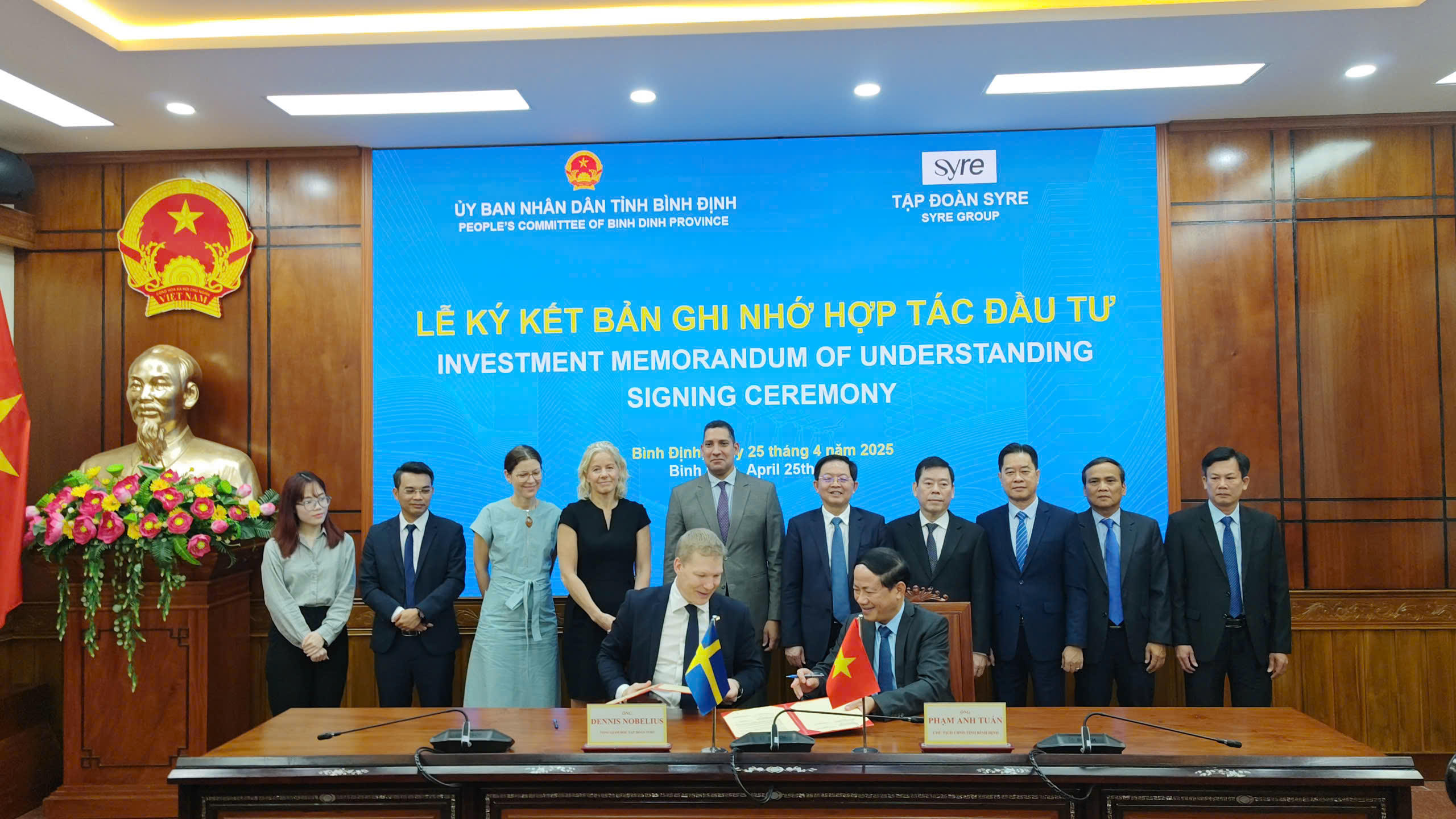 Đại diện UBND tỉnh Bình Định và Tập đoàn Syre, Thụy Điển ký kết Bản ghi nhớ hợp tác. |