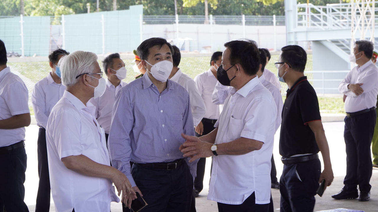 Thứ trưởng Bộ Y tế Trần Văn Thuấn (áo tím) kiểm tra tại cơ sở 2 của Bệnh viện dã chiến số 1 Bình Dương. |