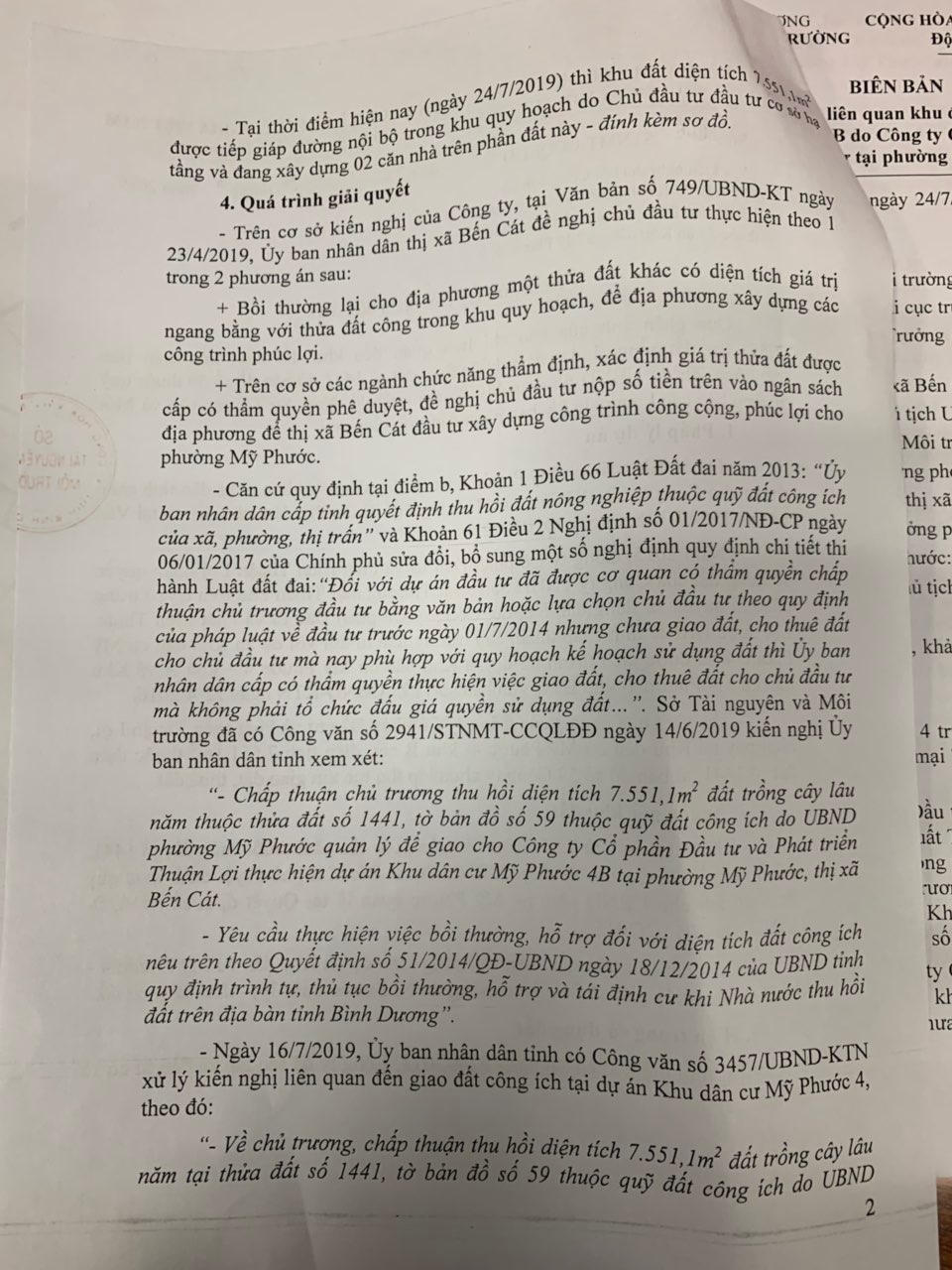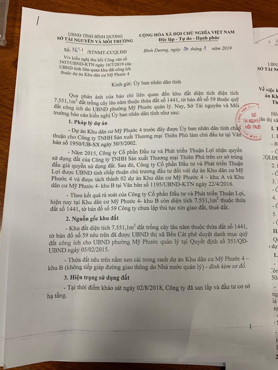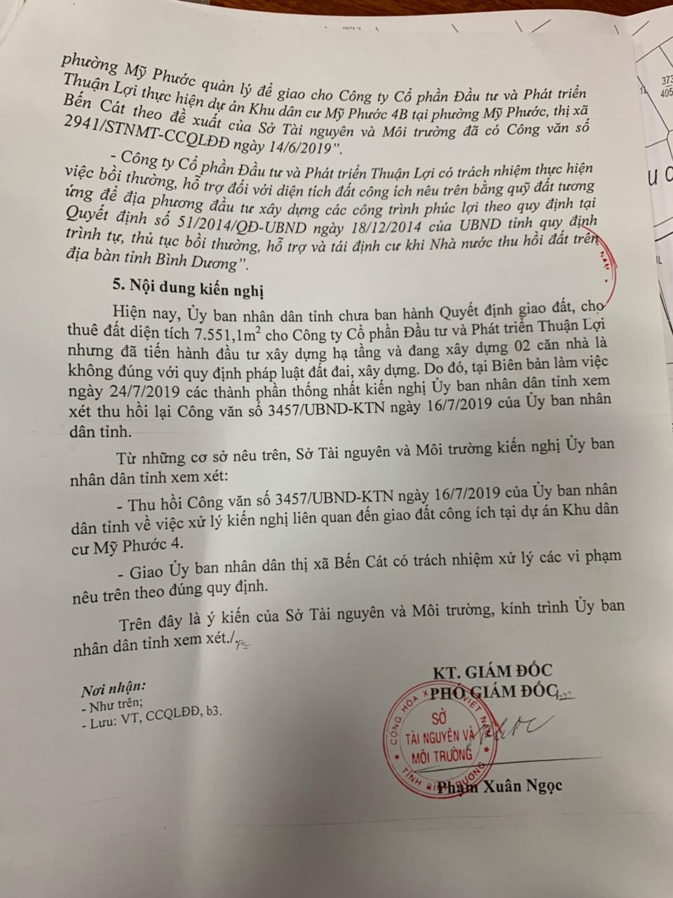 Trước đó, ngày 26/4/2019, Sở TNMT tỉnh Bình Dương đã có Công văn số 2941/STNMT-CCQLĐĐ kiến nghị UBND tỉnh Bình Dương xem xét chấp thuận chủ trương thu hồi diện tích 7.551m2 đất này để giao cho Cty Thuận Lợi thực hiện dự án, yêu cầu Cty Thuận Lợi thực hiện việc bồi thường, hỗ trợ đối với diện tích đất công ích theo quy định. Ngày 16/7/2019, UBND tỉnh Bình Dương có Công văn 3457/UBND- KTN chấp thuận theo đề nghị của Sở TNMT về việc thu hồi đất, giao cho Cty Thuận Lợi thực hiện dự án.