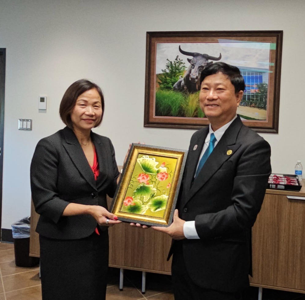 Chủ tịch UBND tỉnh Bình Dương Võ Văn Minh tặng quà lưu niệm tại Đại học Nebraska Omaha |