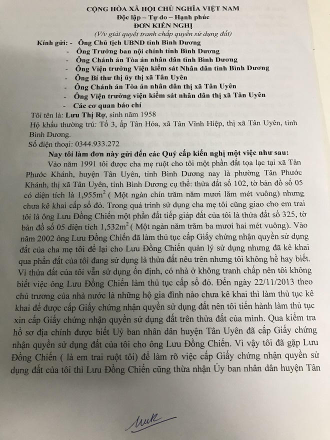 Theo đơn của bà Lưu Thị Rợ (SN 1958, ở ấp Tân Hóa, xã Tân Vĩnh Hiệp, thị xã Tân Uyên, Bình Dương), năm 1991, bà được cha mẹ ruột cho một phần đất tại xã Tân Phước Khánh, thị xã Tân Uyên (thửa số 102, tờ bản đồ số 05, diện tích 1955m2).