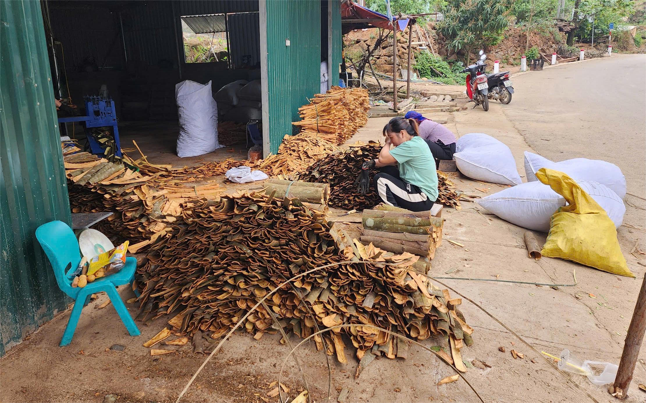 | Quế sau khi thu được chở về sơ chế, phân loại thành quế thanh để phơi khô và quế vụn để tận thu. |