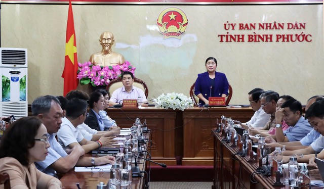 Bà Trần Tuệ Hiền - Chủ tịch UBND tỉnh Bình Phước phát biểu tại cuộc họp bàn kế hoạch tổ chức diễn đàn. |