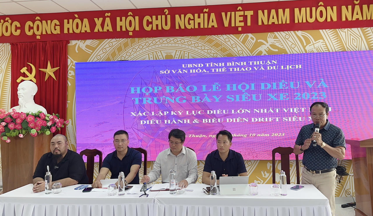 (PLVN) - Chiều 16/10, Sở Văn hoá, Thể thao và Du lịch tỉnh Bình Thuận đã tổ chức Họp báo “Lễ hội diều xác lập kỷ lục Guinness diều lớn nhất Việt Nam và kết hợp diễu hành siêu xe (ô tô)” năm 2023.
