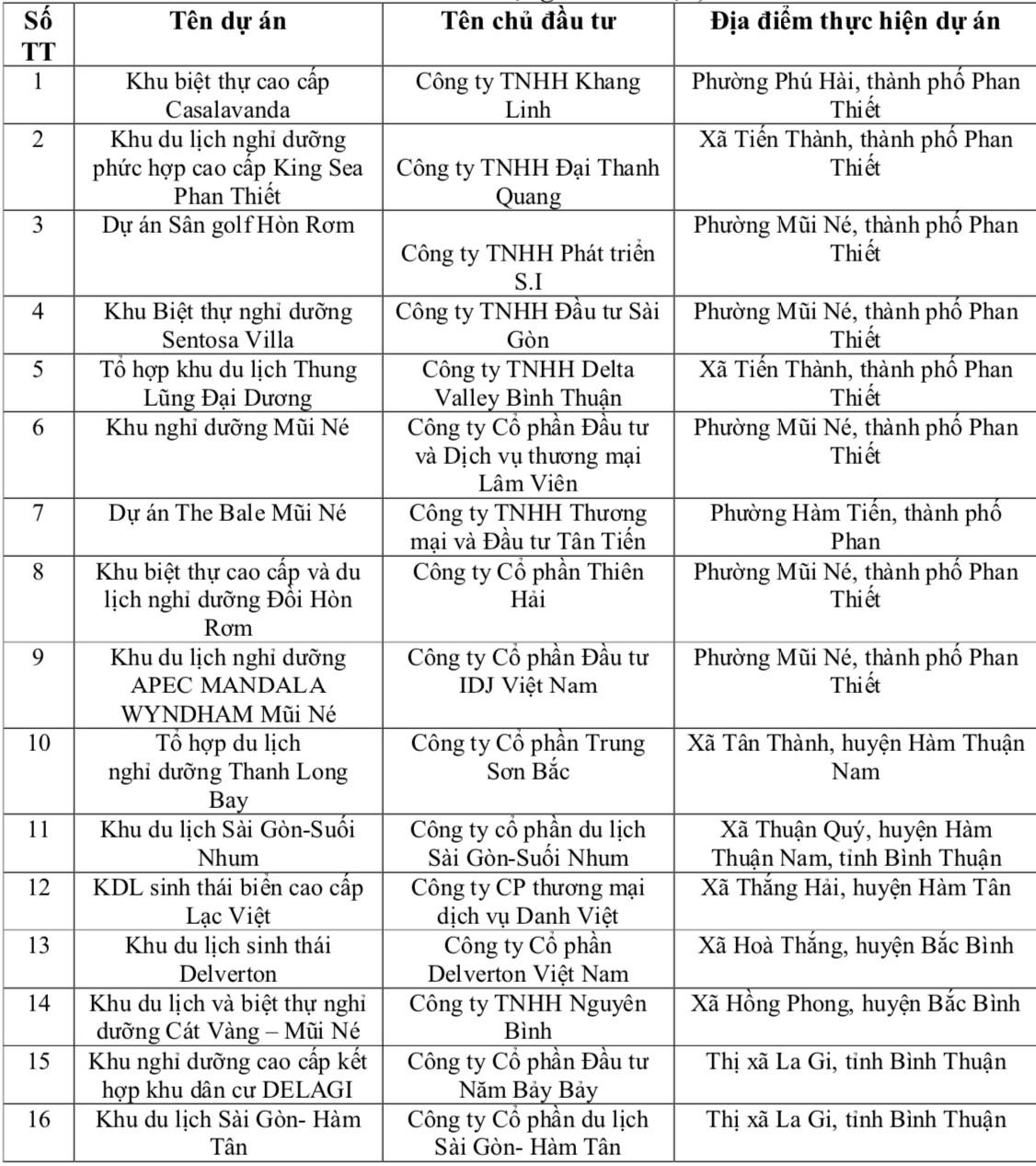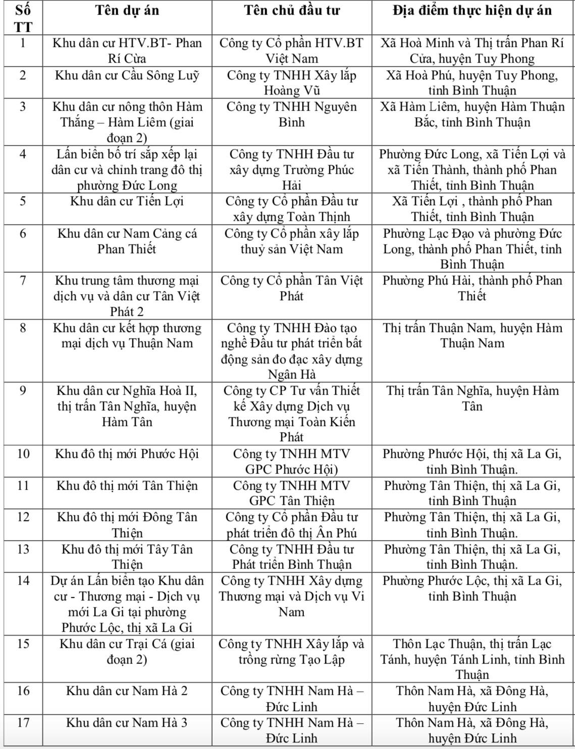 Danh sách 17 dự án khu dân cư, khu đô thị và 16 dự án du lịch nghỉ dưỡng, như sau: