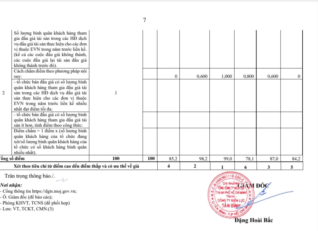 Tại thông báo này, trong bảng kết quả chấm điểm mục III: Năng lực, kinh nghiệm và uy tín của tổ chức đấu giá tài sản, ở tiêu chí 1 - Trong năm trước liền kề đã thực hiện hợp đồng dịch vụ đấu giá cùng loại tài sản với tài sản dự kiến đưa ra đấu giá, Công ty Điện lực Bình Phú chấm 4 điểm cho Đấu giá Vạn Thành An.