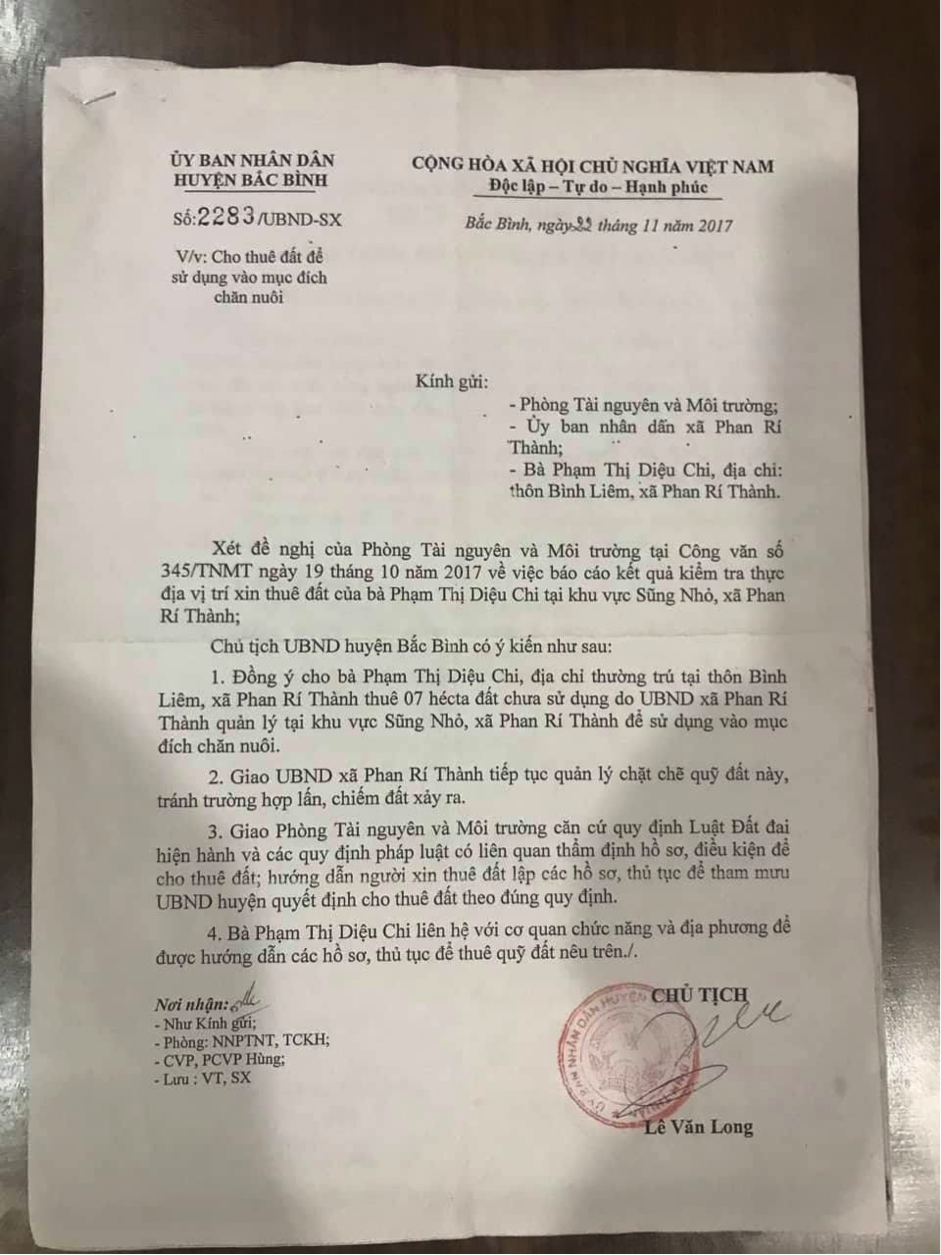 Sau kết quả khảo sát, cơ quan chức năng đã khẳng định mảnh đất 07 hecta tại khu vực Sũng Nhỏ là đất đồi cát và chưa sử dụng. Từ đó, đại diện của UBND huyện Bắc Bình là Chủ tịch UBND Lê Văn Long đã ký văn bản số 2283/UBND-SX về việc cho thuê đất sử dụng vào mục đích chăn nuôi. Văn bản này được ký vào ngày 22/11/2017. Tức là sau hơn 2 năm, bà Chi xin phép thuê đất của huyện Bắc Bình.