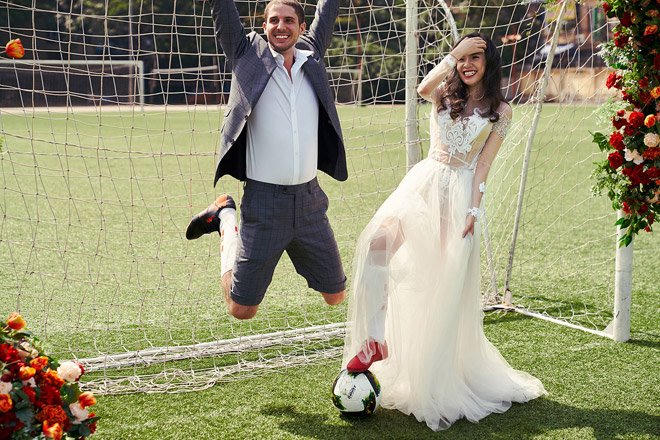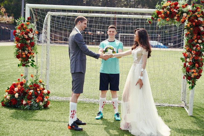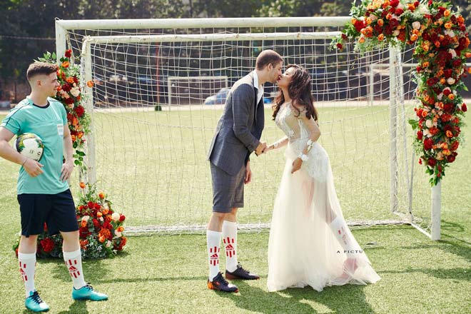 Chú rể diện quần đùi, cô dâu mặc váy cưới nhưng đi tất và giày bóng đá. Họ không e ấp tạo dáng bên nhau mà cùng chơi đùa với trái bóng và chính sự tự nhiên ấy đã cho ra những bức ảnh cưới tuyệt đẹp.