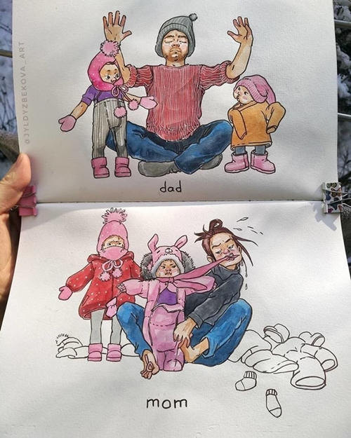 (PLO) - Nhiều bà mẹ tìm thấy chính mình trong những bức tranh về cuộc sống 'bỉm sữa' của họa sĩ người Kyrgyzstan, Jyldyz Bekova.