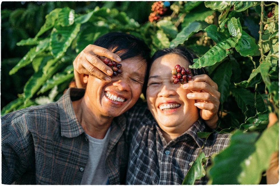 Bộ ảnh ghi lại loạt khoảnh khắc tình tứ của đôi vợ chồng với phông nền là vườn cà phê đang vào mùa thu hoạch. Dưới tán cà phê xanh mướt, đôi vợ chồng ở tuổi xế chiều hồn nhiên đùa vui, trao cho nhau nụ cười lấp lánh niềm hạnh phúc.